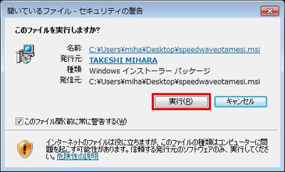 2.「セキュリティーの警告」の画面が表示されますので、「実行」をクリックします。