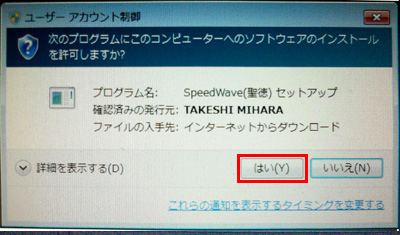 7.「ユーザーアカウント制御」の画面が表示されますので、「はい」をクリックします。