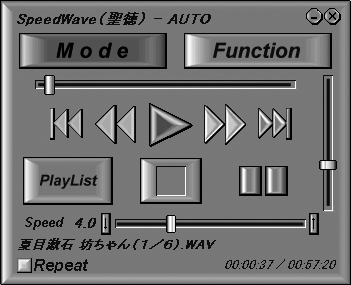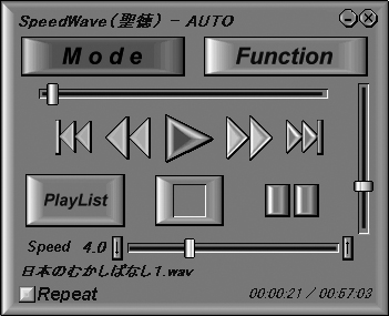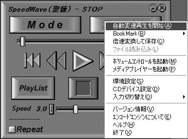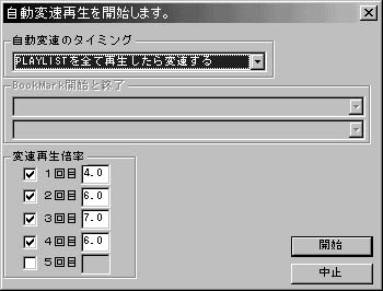 PlayListのファイルをファイル単位の自動変速で再生する PlayListのファイルを全部終了後の自動変速で再生する BookMark〜BookMarkを自動変速で再生する AutoPlayはSETUP画面の「繰り返し再生を行う」にチェックしておくと、最後の倍率を再生した後も止まらずに最初の倍率から再生を繰り返します。