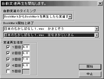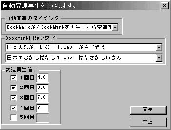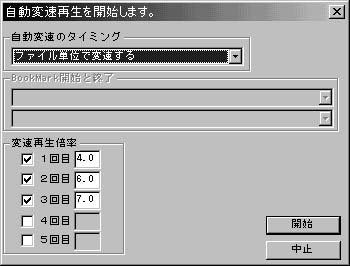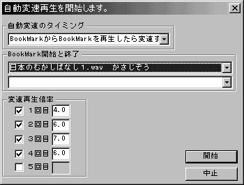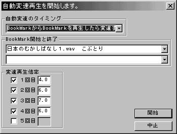 1.「FUNCTION」→「自動変速再生を開始」を選択します。 2.自動変速のタイミングで「BookMarkからBookMarkを再生したら変速する」を選択します。 3.BookMark開始と終了の所の上段に開始するBookMarkを設定します。 BookMark開始と終了の所の上段になにも表示されない場合はBookMarkがなにも指定されていません。 こちらのBookMarkの説明を参照してBookMarkを追加、またはロードしてください。 4.BookMark開始と終了の所の下段に終了するBookMarkを設定します。 BookMark〜BookMarkの変速再生では同じファイル内である必要があります。 BookMark開始と終了の所の下段になにも表示されない場合は同じファイル名のBookMarkが無いか、 または、開始位置よりも後ろのBookMarkが無いかのどちらかです。 5.変速再生倍率を入力します。 6.開始ボタンを押します。(再生が開始されます。)