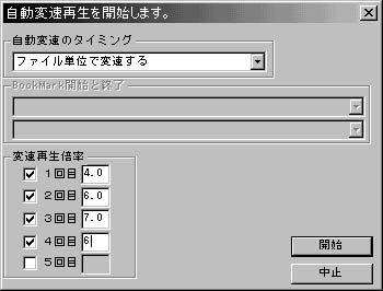 1.「FUNCTION」→「自動変速再生を開始」を選択します。 2.自動変速のタイミングで「ファイル単位で変換する」を選択します。 3.変速再生倍率の所を指定します。 ここでは4回目に6倍を追加します。 チェックを付けて6.0を入力します。 4.開始ボタンを押します。(再生が開始されます。)