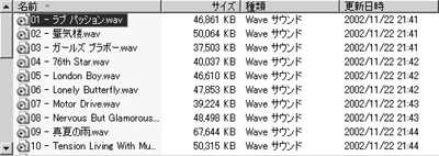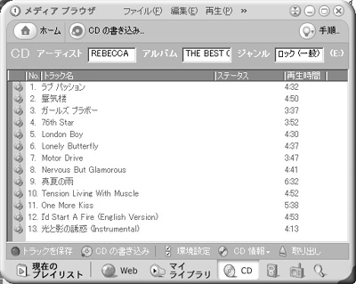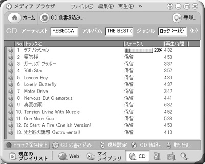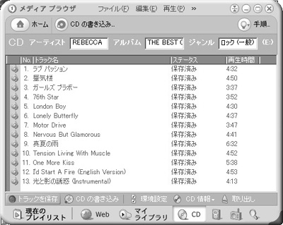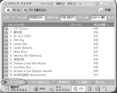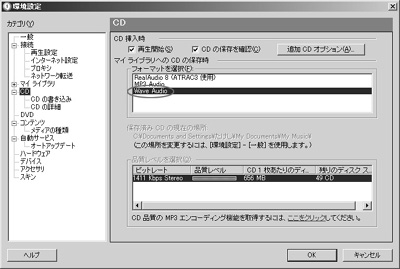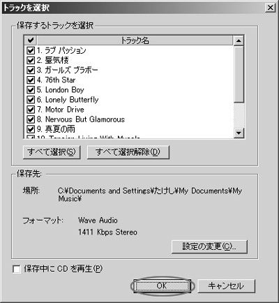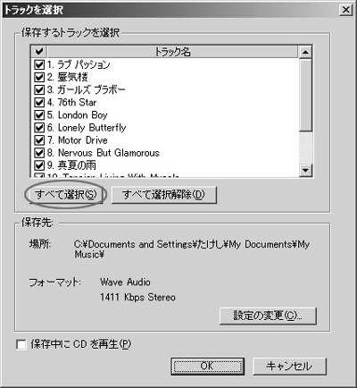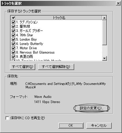 1.起動します。 2.起動後CDを選択します。(画面下側) この時、内臓ドライブにCDをセットしておいてください。 3.「トラックを保存」をクリックします。 4.「全て選択」をクリックします。 5.「設定の変更」をクリックします。 6.「Wave Audio」を選択します。 「OK」をクリックして元の画面の戻ります。 注 本当はMP3を選んで聖徳で再生出来れば良いのですけど今の所、RealPlayerの新しいMP3ファイル形式に対応していません。今後、努力していきますのでお許しを... その後...努力の結果そのままMP3ファイル形式を選択してもOKになりました。 7.「OK」をクリックします。 8.変換が始まります。 9.変換が終了すると、 マイミュージック等のフォルダにWaveファイルが作成されています。 Waveファイルのままでも聖徳で再生可能ですが、このままではファイルが大きすぎるのでMP3にしてファイルサイズを小さくしておきましょう