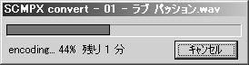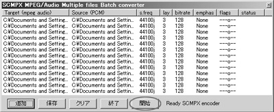1.SCMPXを起動します。 2.「Convert」ボタン→「MiltipleFiles」→「EncodingMPx」と選択します。 SCMPX MPEG/Audio Multiple files Batch converter 画面が表示されます。 3.「追加」ボタンをクリックします。 「ファイルを開く」画面が表示されます。 4.先ほど「RealPlayer」で作成したWaveファイルを選択し、「開く(O)」をクリックします。 複数選択可能です。CTRL+Aボタンで全てを選択可能です。 5.MP3ファイルを出力するフォルダを選択します。 ここではデスクトップを選択します。 「OK」をクリックします。 SCMPX MPEG/Audio Multiple files Batch converter 画面が表示され、先ほど選択したファイルが表示されています。 6.開始をクリックします。 7.変換が開始されます。 8.後は少し待てば変換が完了します。
