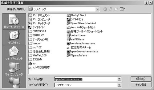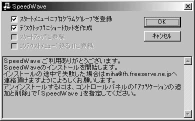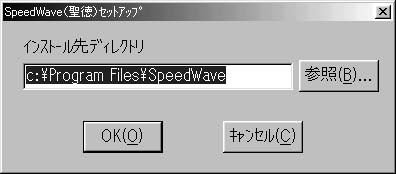 1.デスクトップに作成した「speedwaveotamesi.exe」のアイコンをダブルクリックしてインストールを開始します。 2.インストール先ディレクトリを変更する場合は変更してOKを押します。(通常はそのままOKを押して下さい) 3.インストールの選択メニューでそのままOKを押してください。 4.インストールが成功します。OKを押します。 5.デスクトップに次のようなショートカットが作成されます。