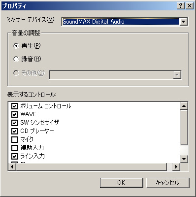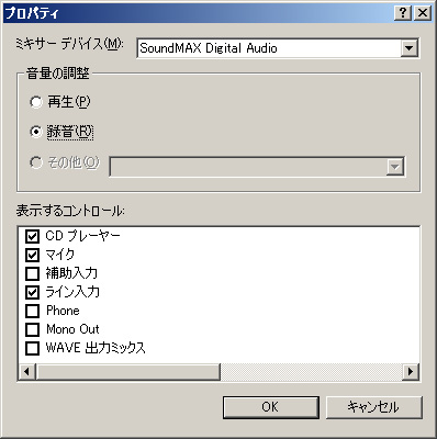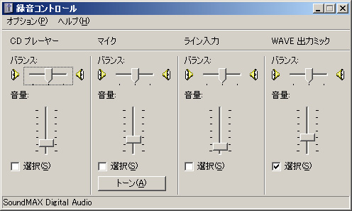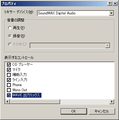 「OK」をクリックします。 録音コントロールに「WAVE出力ミックス」が追加されています。 このマシンでは「WAVE出力ミックス」ですが、この名前はマシンによって異なります。 「ステレオ出力」「STEREO OUT」等がある場合はそれをチェックして下さい。