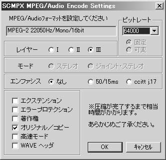 (ビットレートを64000に設定してください。この値は大きいほど高音質になります。64000に設定すればWaveファイルとほとんど差が有りません。但し、音質とファイル容量は反比例する関係にあります。)